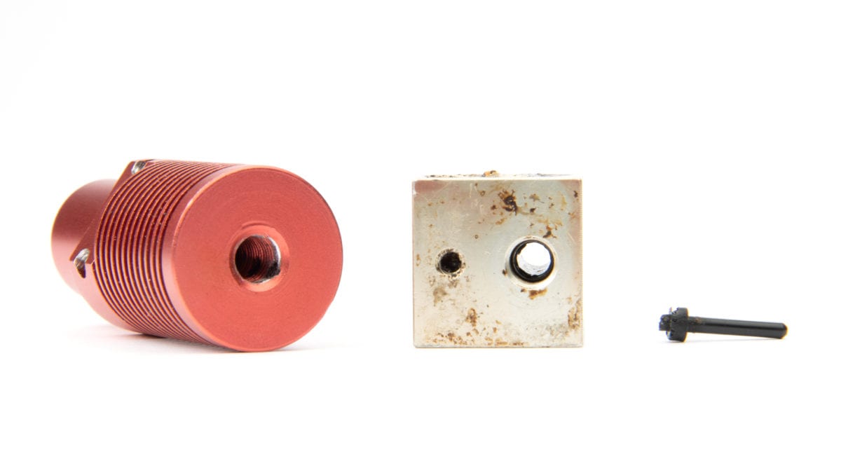 In the image above on the left we see a heat sink and a heat block from a CR-10S Pro, and a piece of filament from a cold pull.