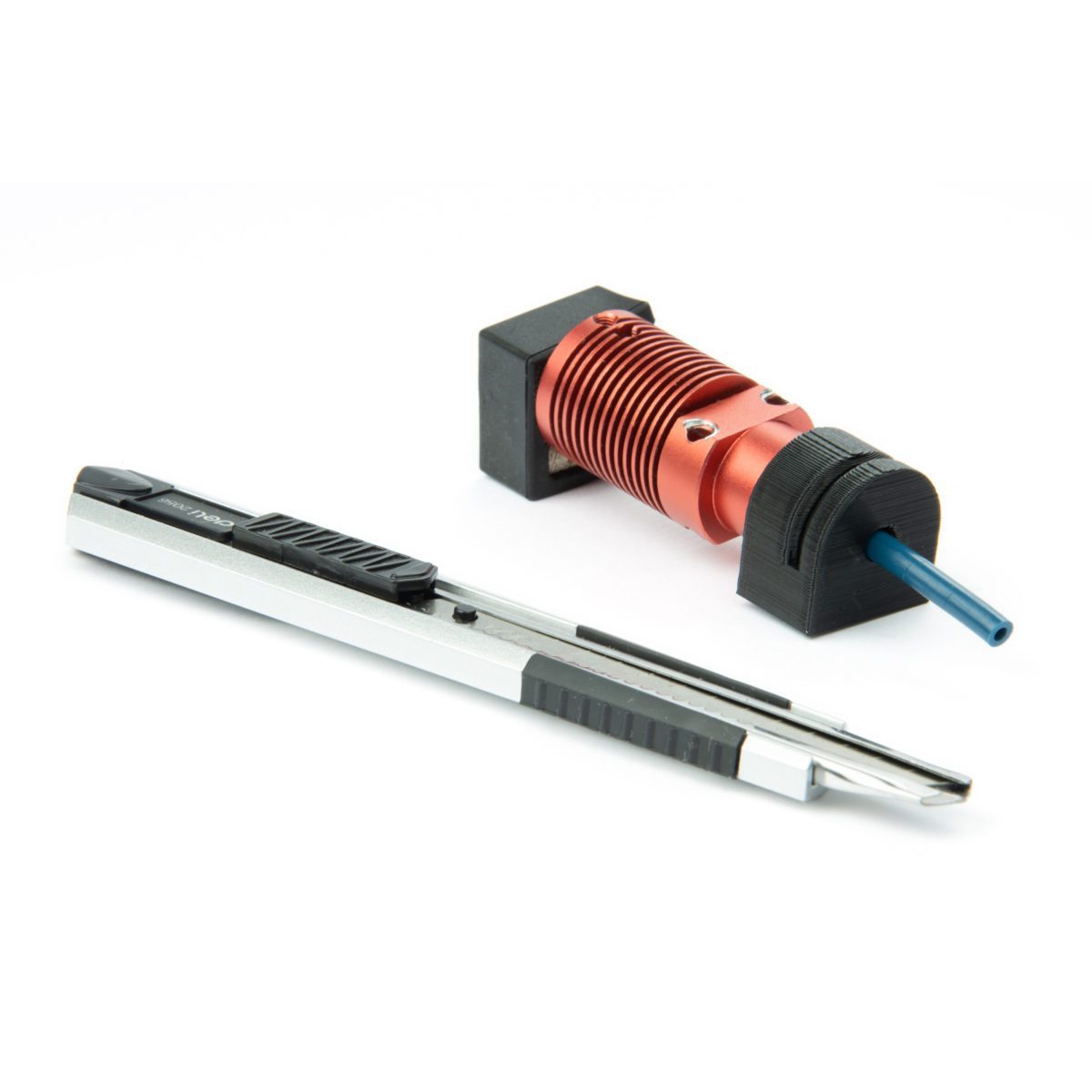 On Phase 1 the DDX uses the original hotend that comes with the printer, and improves upon it by replacing the PTFE tube inside with a Capricorn. We also supply a model of a tool to cut it to spec. The main advantage of the Capricorn tube in relationship to the regular PTFE is known. It is more heat tolerant and shows less shrinking along time, while exposed to the high temperatures of the heat block and nozzle.