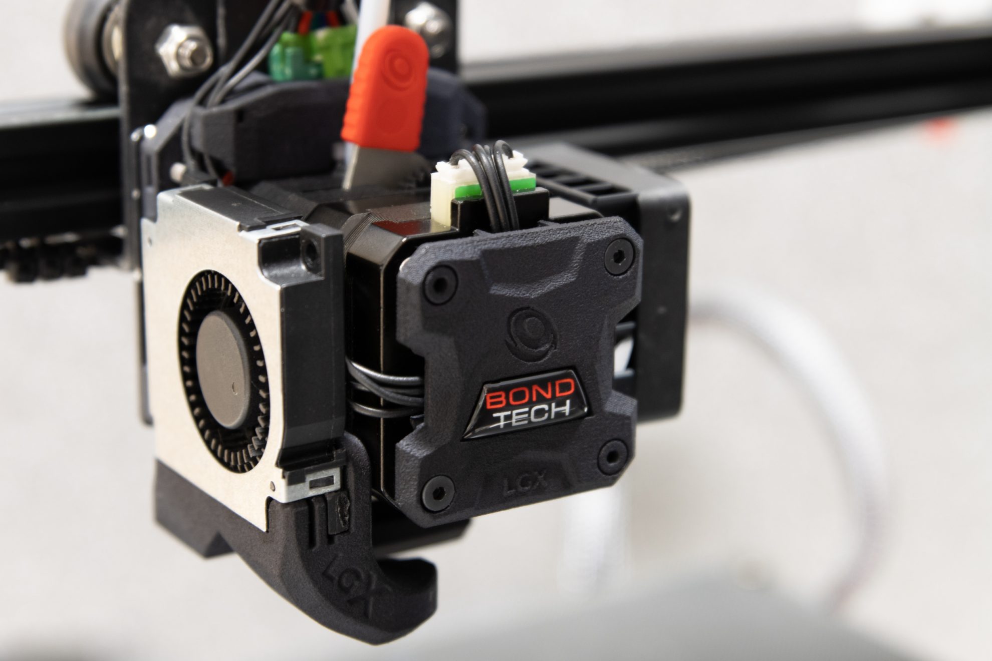 • Shows the Bondtech branding on the stepper motor;